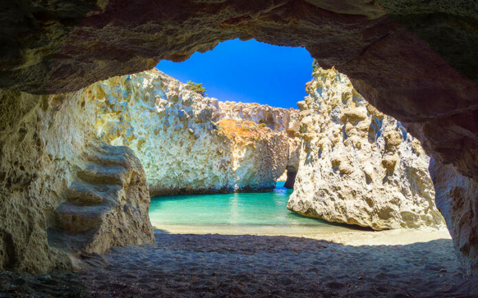 Also located on the island of Milos, Papafragas Cave is a hidden gem waiting to be discovered. Nestled between towering cliffs, this cave boasts crystal-clear waters ideal for swimming and snorkeling.
